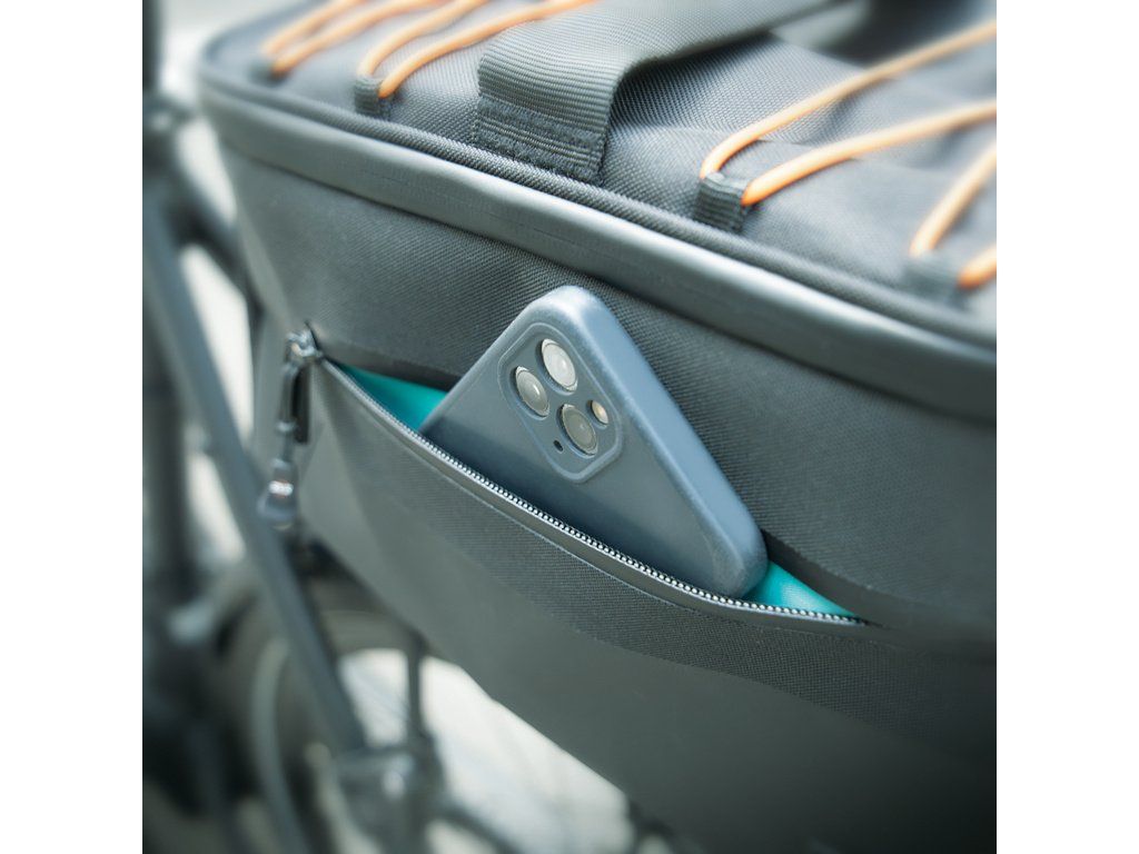 Už žádný chaos ve vaší brašně! Přihrádka vzadu, vnitřní přepážka a síťovaná přihrádka v horní části brašny vytvářejí pořádek a umožňují rychlý přístup. Vršek lze plně otevřít pomocí zipu Easyzip. Dvojitá síťovaná kapsa pojme další drobnosti. Reflexní poutka jsou připevněna na přední a zadní straně pro lepší viditelnost v silničním provozu. Robustní rukojeť a ramenní popruh usnadňují přepravu brašny, i když kolo nepoužíváte. Rozsáhlou výbavu doplňuje praktický nepromokavý obal.